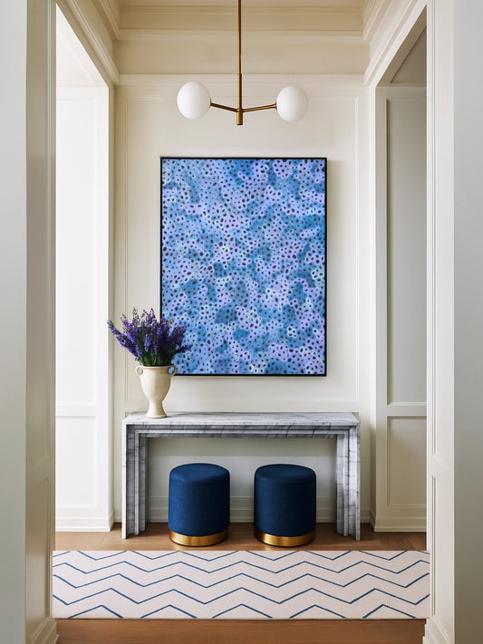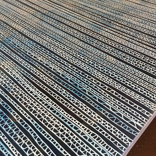 Jennifer Bell's abstract paintings delve into the world of pattern and visual perception. Inspired by the dynamic interplay of colours and patterns and the rich tapestry of designs present in both the natural world and human-made objects and environments. Patterns are ubiquitous, and Bell strives to showcase that beauty can be discovered even in the most unassuming objects and seemingly ordinary places.