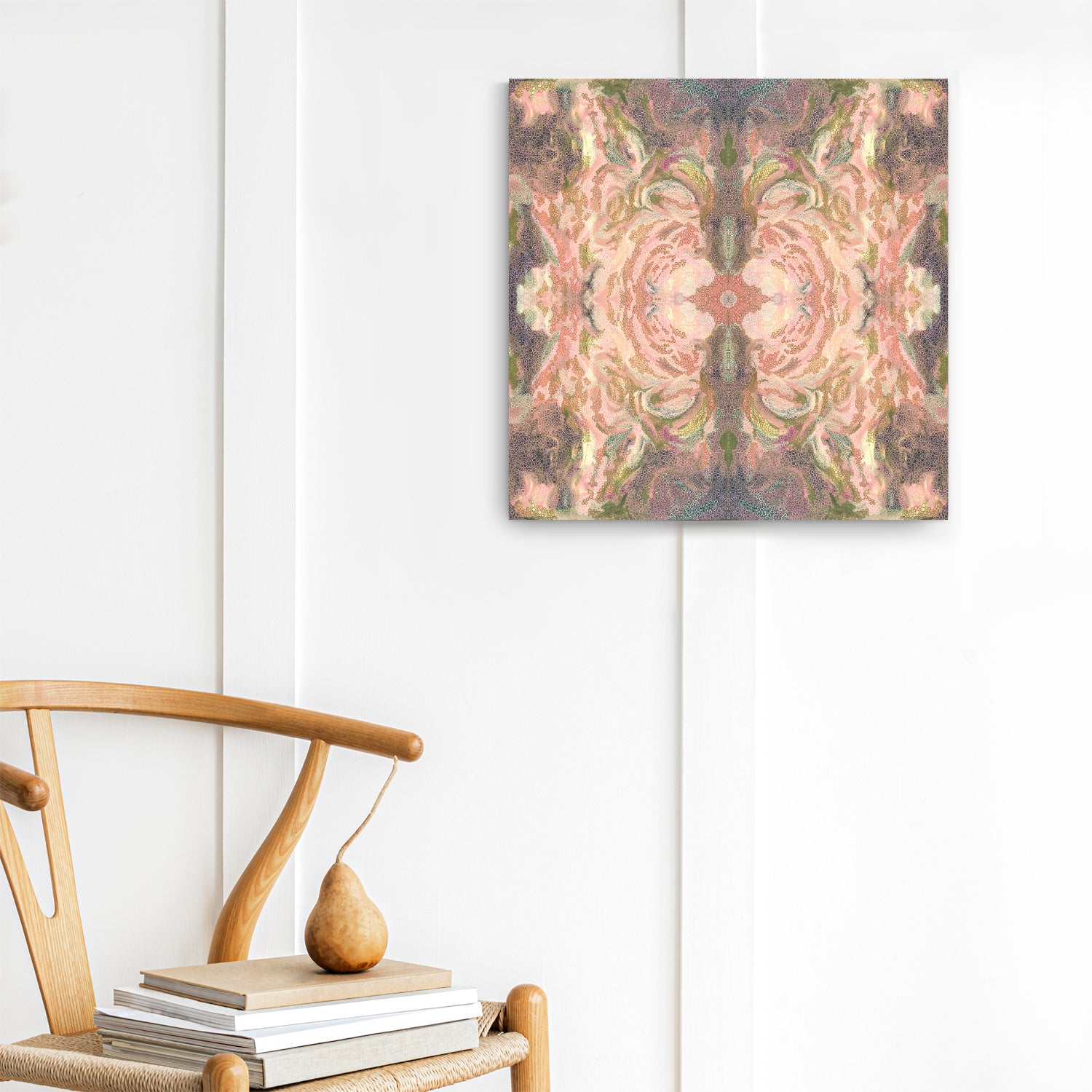Earth Mandala brings together a grounded palette of rich greens, warm terracotta, and straw yellow, forming a swirling base of gestural brushstrokes. Over this dynamic foundation, hundreds of delicate circular marks create a mandala like constellation - a kaleidoscopic twist that feels both organic and meditative.