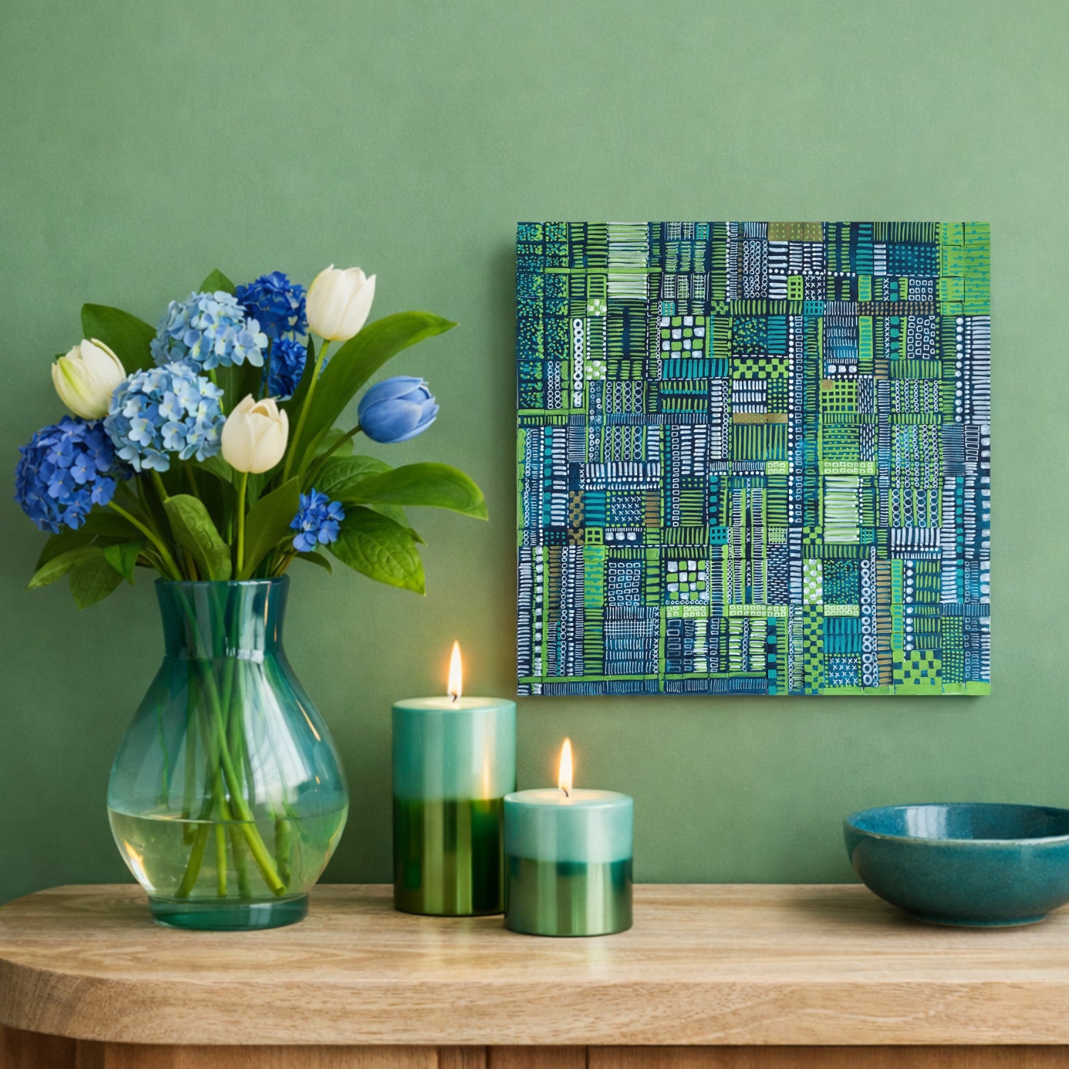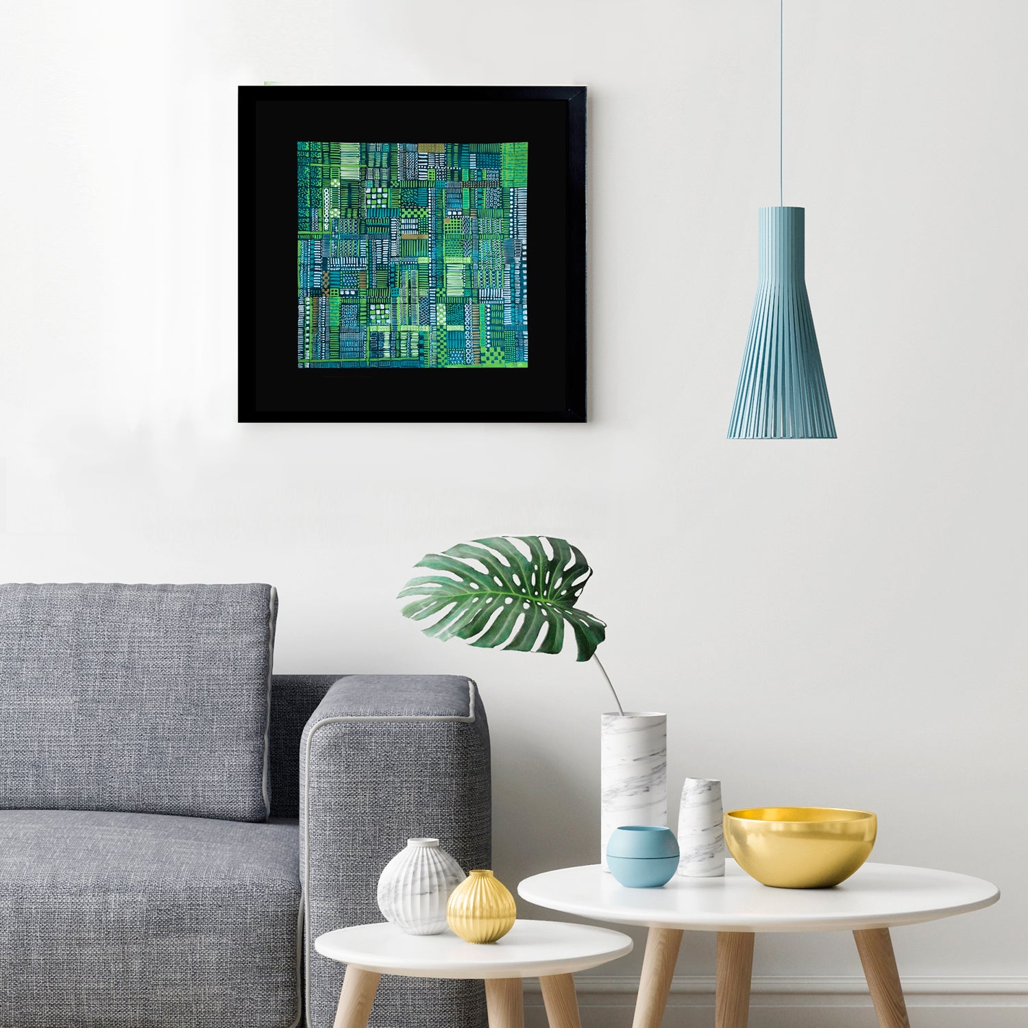 This piece, with its unique acrylic on woven paper construction, offers a compelling visual experience. Its distinct texture and vibrant colors make it a strong addition to any art collection. It's a great choice for those looking for small abstract art, eco-friendly wall art, contemporary green art, or unique geometric pieces for their home or office.
