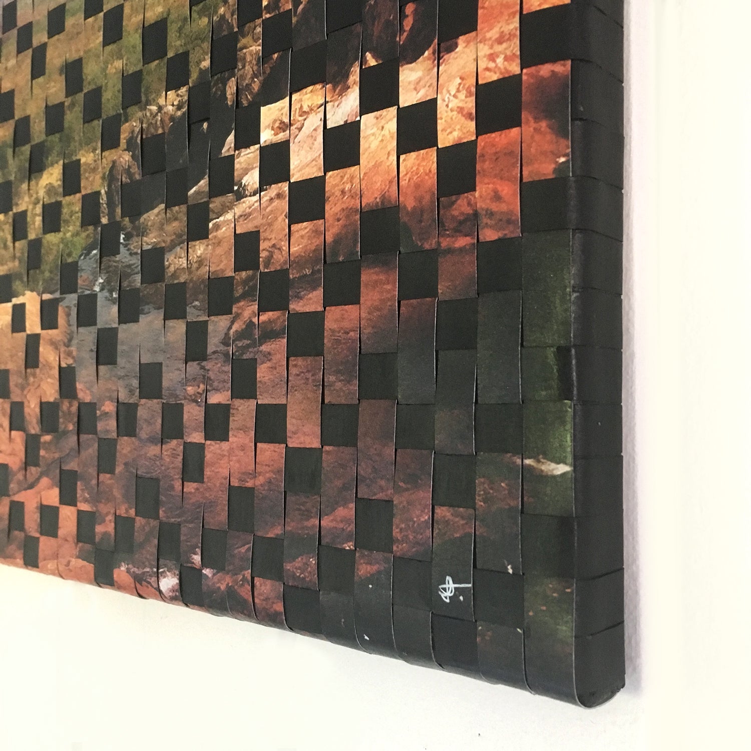 A striking reinterpretation of the Australian landscape, blending traditional photography with contemporary weaving techniques. This piece features a landscape photograph interwoven with blank paper strips, creating a rhythmic distortion that reflects the artist's experience with visual snow—a rare neurological condition that overlays her perception with constant dancing patterns. The fragmented texture and layered composition invites viewers to see the natural world through the lens of this unique sensory perspective.